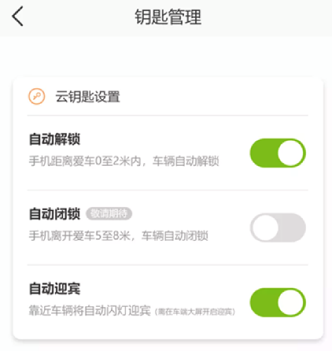 “云钥匙”激活成功后默认关闭“无感模式“,您可以进入“钥匙管理”页面,对“自动解锁”、“自动闭锁”(正在建设中,敬请期待…)、“自动迎宾”等功能进行开启或关闭操作;